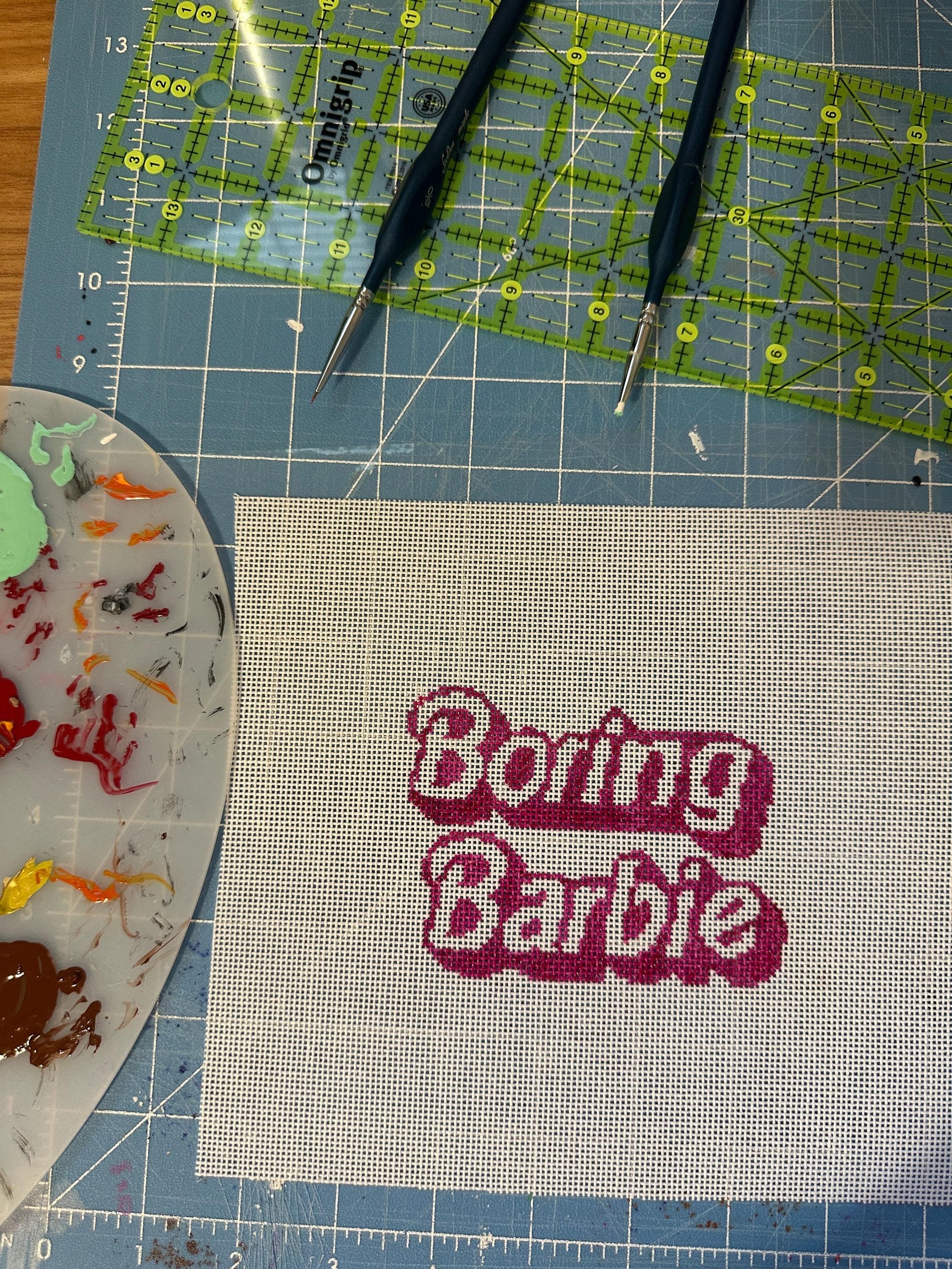 She said “Boring Barbie” and I said, yep, that belongs on a canvas. This hand-painted canvas is for the Swiftie who catches every lyric and needs a little Barbie-core sass in their stitch stash.